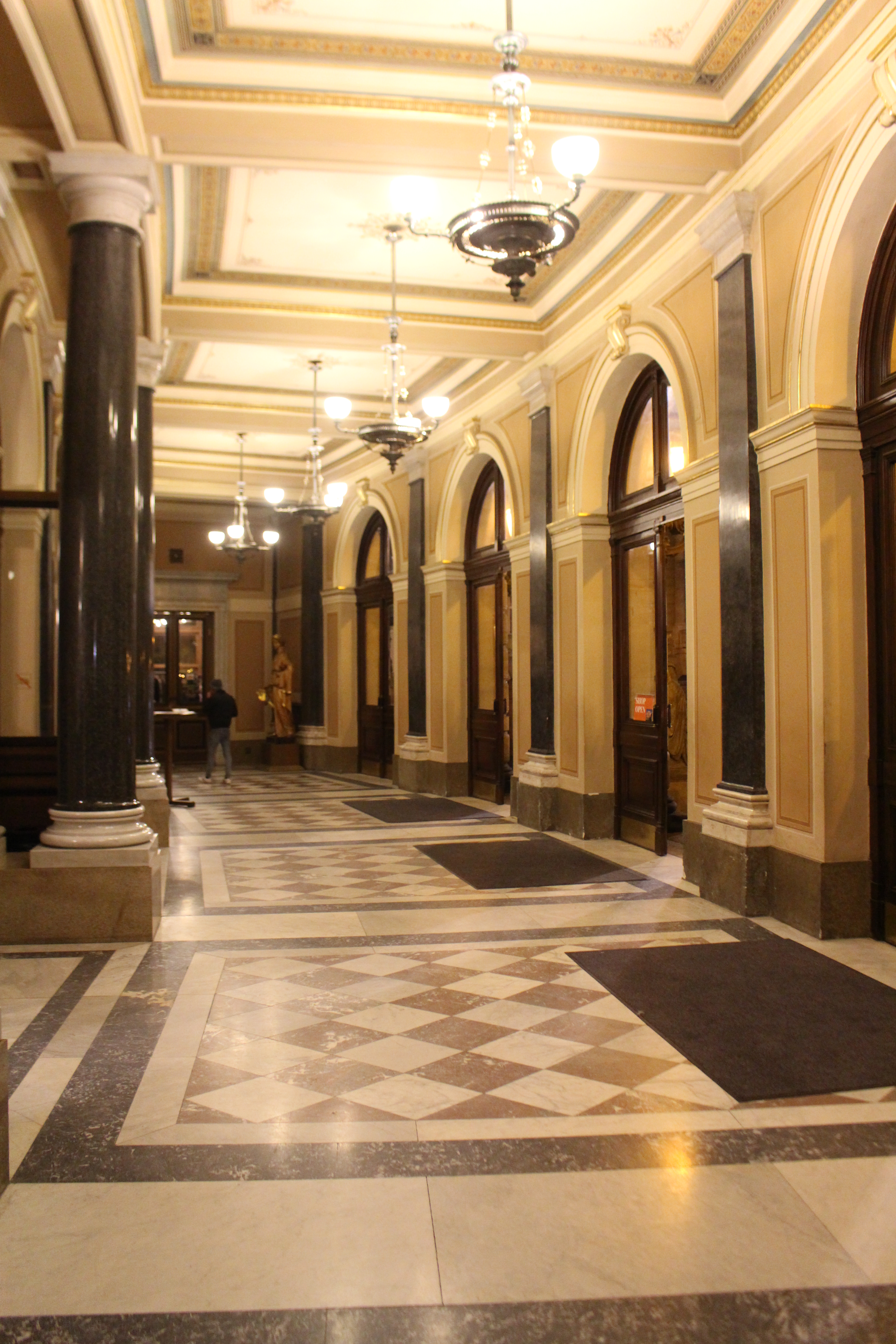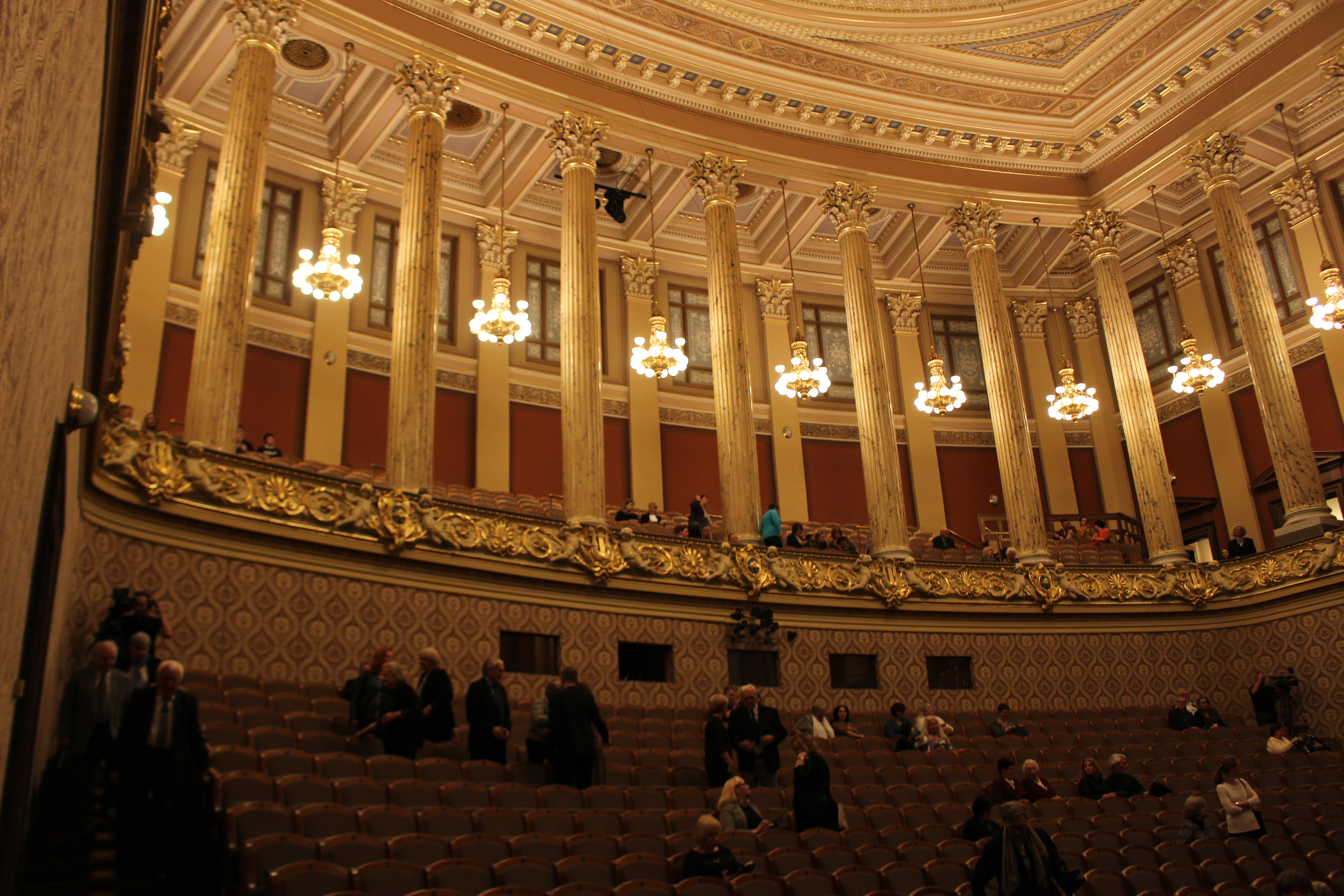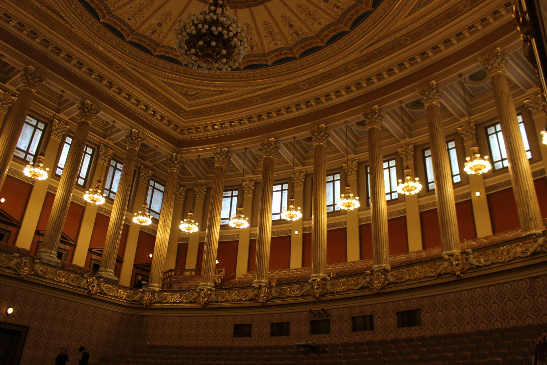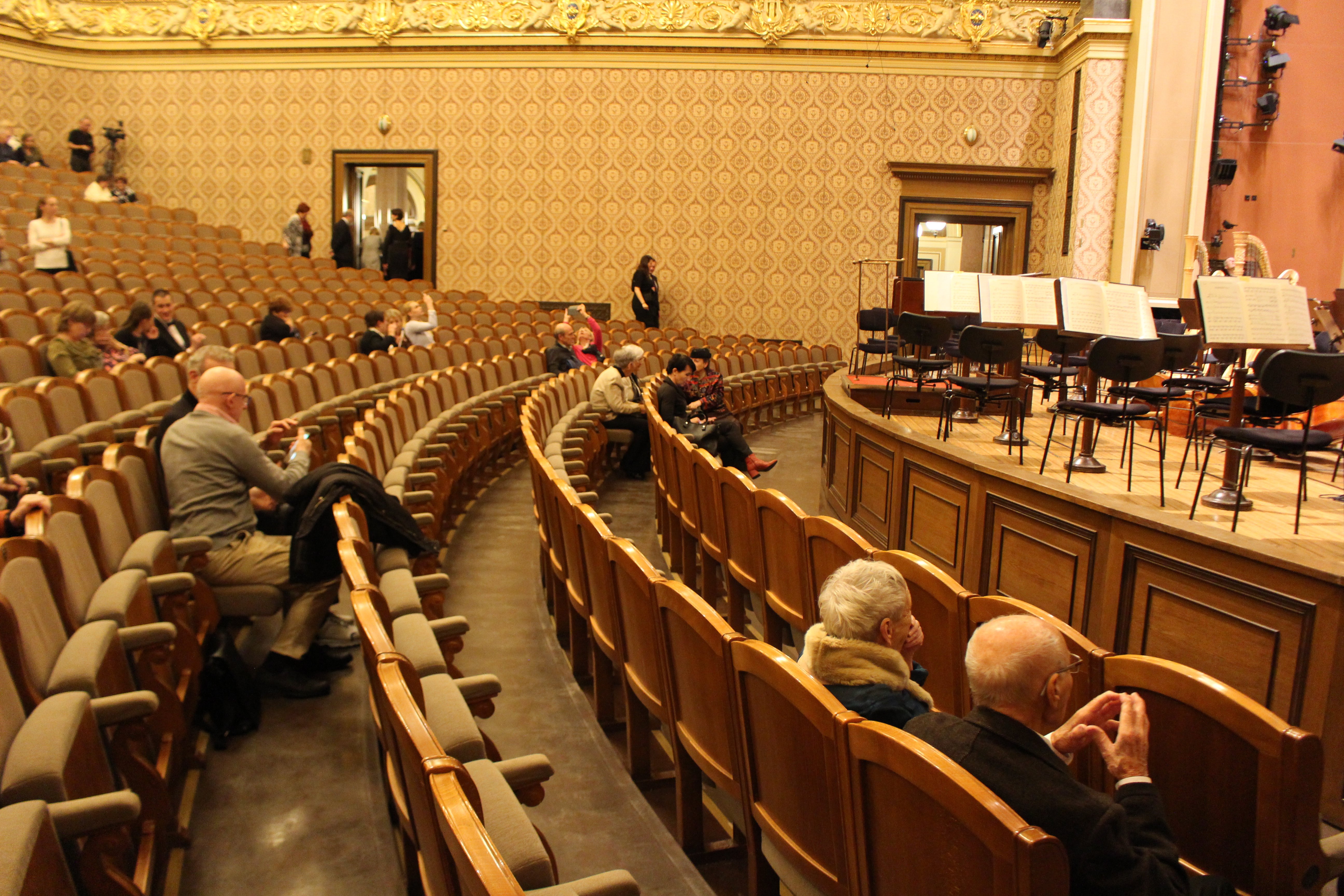 ルドルフィヌムは「芸術家の家」と呼ばれる。ヴルタヴァ川の向こうにプラハ城を臨み、旧市街からも徒歩圏。トラムの駅からも近い。ステージに立ったドヴォルザークホールは、これまで約40年の合唱歴で体験したことのない雰囲気だった。エントランスホール、楽屋、付帯設備など演奏する者の気持ちを高めてくれる。そして目の前に広がる客席は、二階席には柱が高くそびえ立ち、天井までが高く空間が広い。そのため残響が長いが、繊細に響くように感じられた。ステージに立って歌う側には心地良かった。ステージの床板や山台などは建てられた当時のままのようで(実際には違うだろうが)、お世辞でもきれいとは言えず、年季が入っているのも魅力だと感じた。ホールの廊下にあるチェコフィルの歴代首席指揮者たちの胸像をはじめ、一つひとつに歴史を重ねてきた慈しみを感じた。私たちがリハーサルをさせてもらった小ホール「スーク・ホール」も、弦楽四重奏など小編成向けのホールとして格調の高さを感じた。