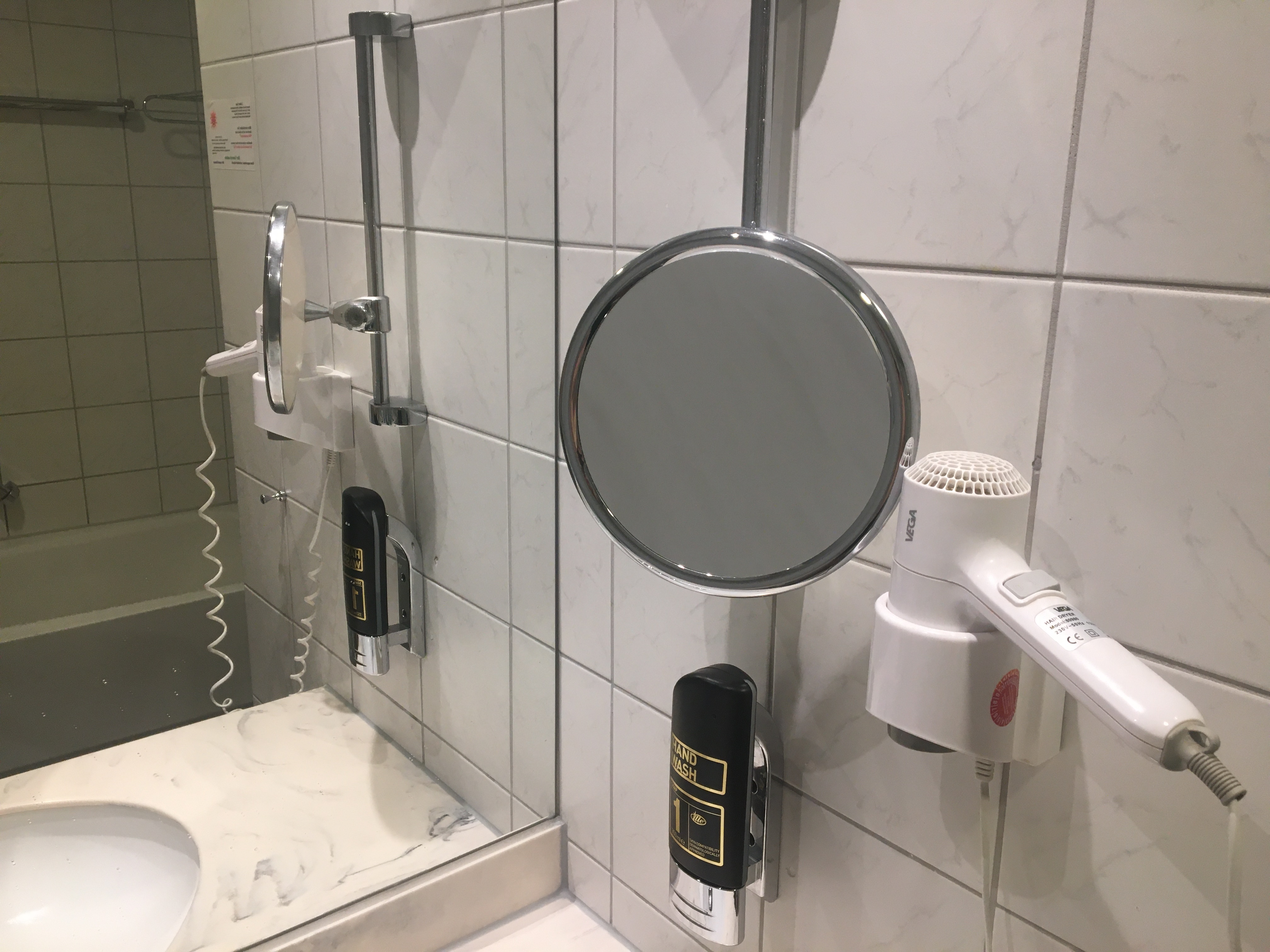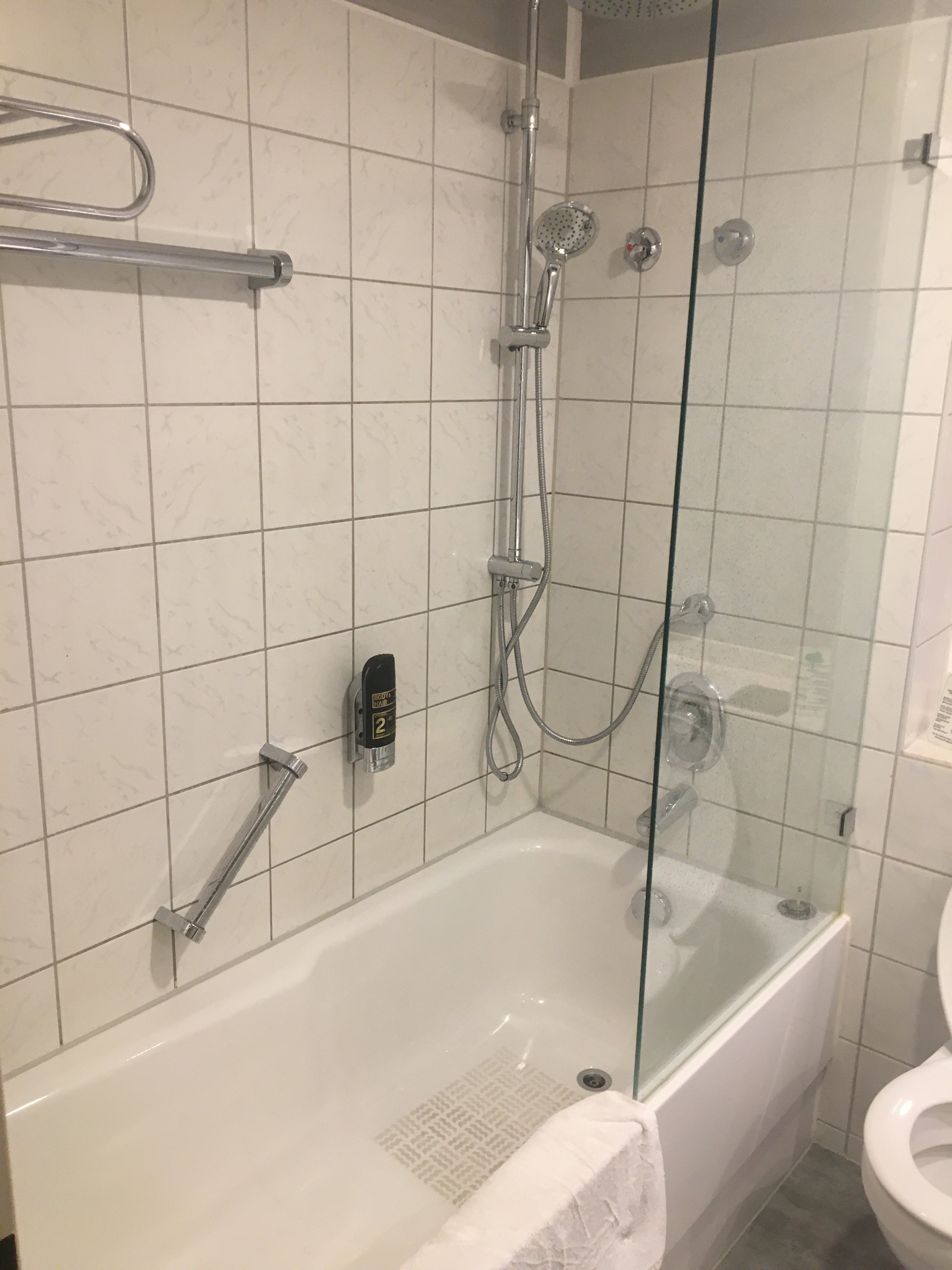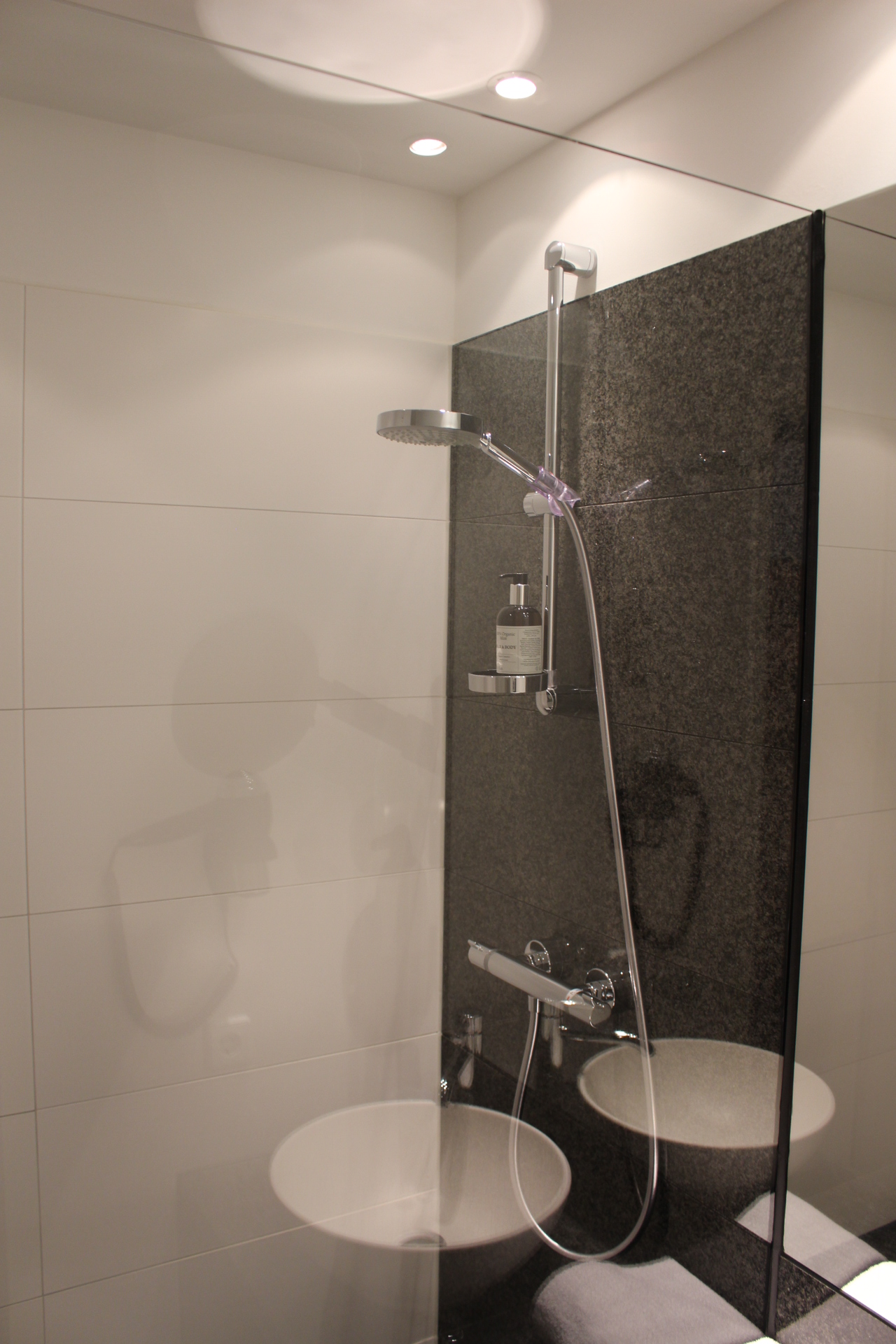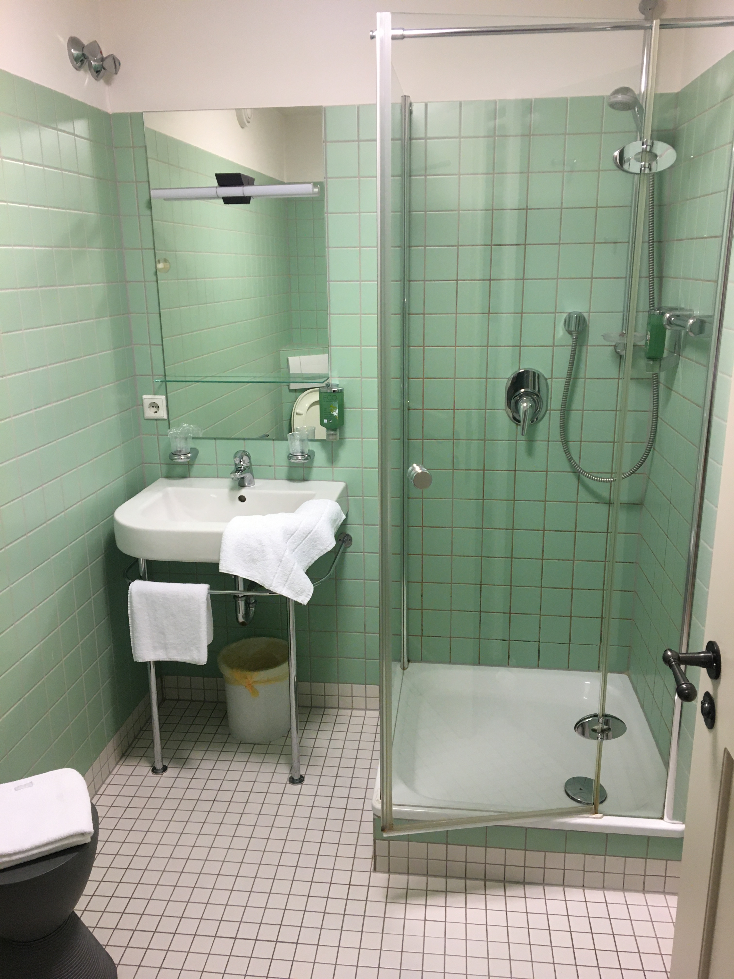ドイツのツーリスト向けホテルは、シャワーがほとんど。バスタブがついているホテルは少ない印象だ。シャワールームもさまざま。ガラスやアクリル扉で閉め切るタイプもあれば、アクリル板で仕切られている(全面ではなく半分程度)ようなタイプ、カーテンなどもある。注意してシャワーを浴びないと、床がビチョビチョになることもある。シャワーは、パイプを上下させて高さを変えて使う。