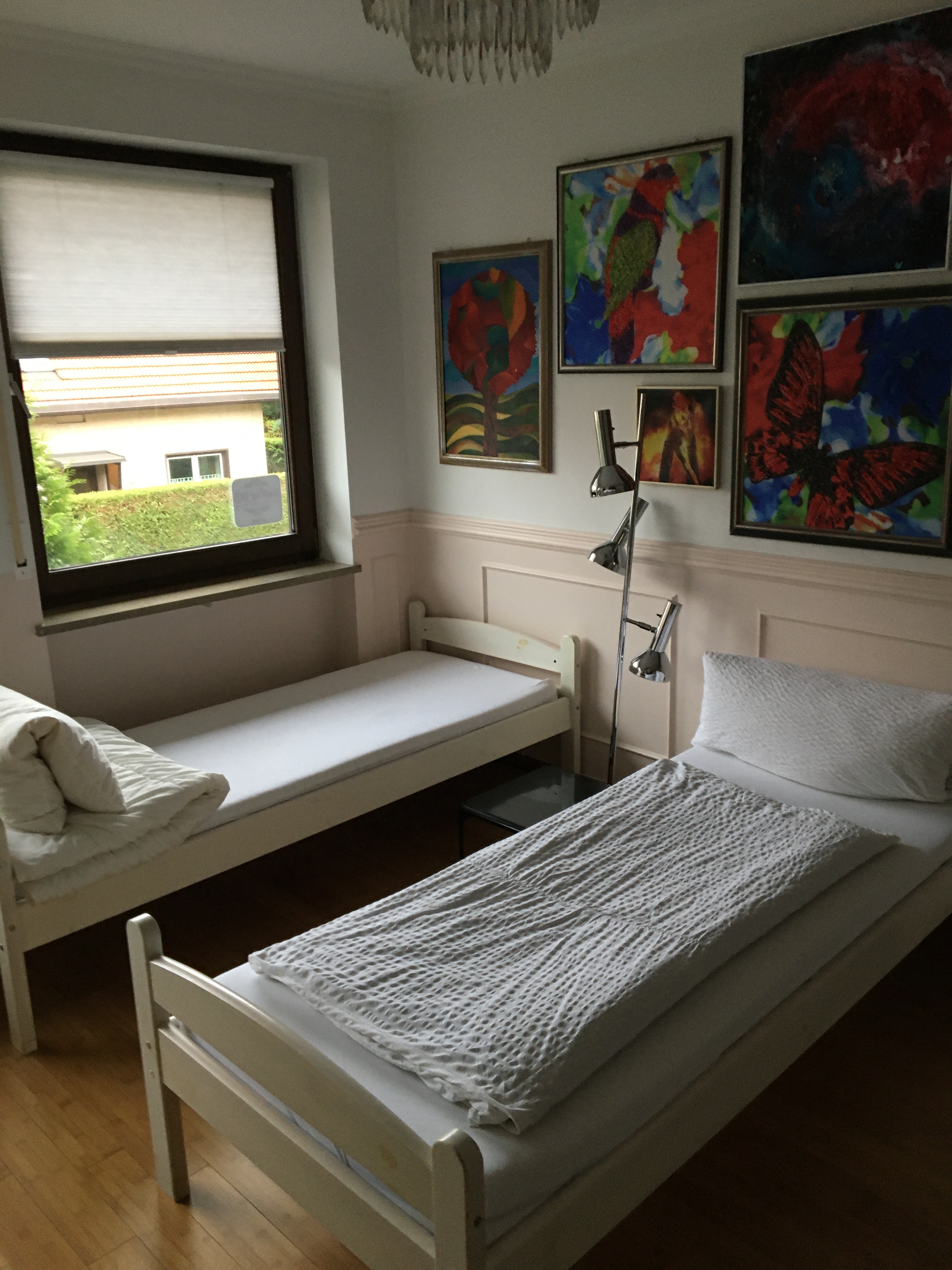 市内ガスタイクでコンサートを聴き、早朝に出発するだけの滞在なので、なるべく安く済ませたかった。B&Bを選んだ基準は、空港に近いSバーンの駅から歩けること。周辺にはホテルが少なかった。7時35分発の飛行機に乗るには不安だったので、暗い朝5時には宿を出た(そんなに早く出る必要はなかったが・・・)。通常なら朝食が付くが、朝早く出ることを前日に告げておくと、パンとリンゴの入った袋をテーブルの上に用意しておいてくれた。こういう配慮は嬉しかった。この宿のオーナーはお父さんが画家だったそうで、壁に作品がかかっていた。マダムは韓国出身でとてもフレンドリーな方だった。東洋人同士でとても助かった。宿の食堂・台所は共有で自炊も可能で、シャワーはフロアごとに用意されていた。