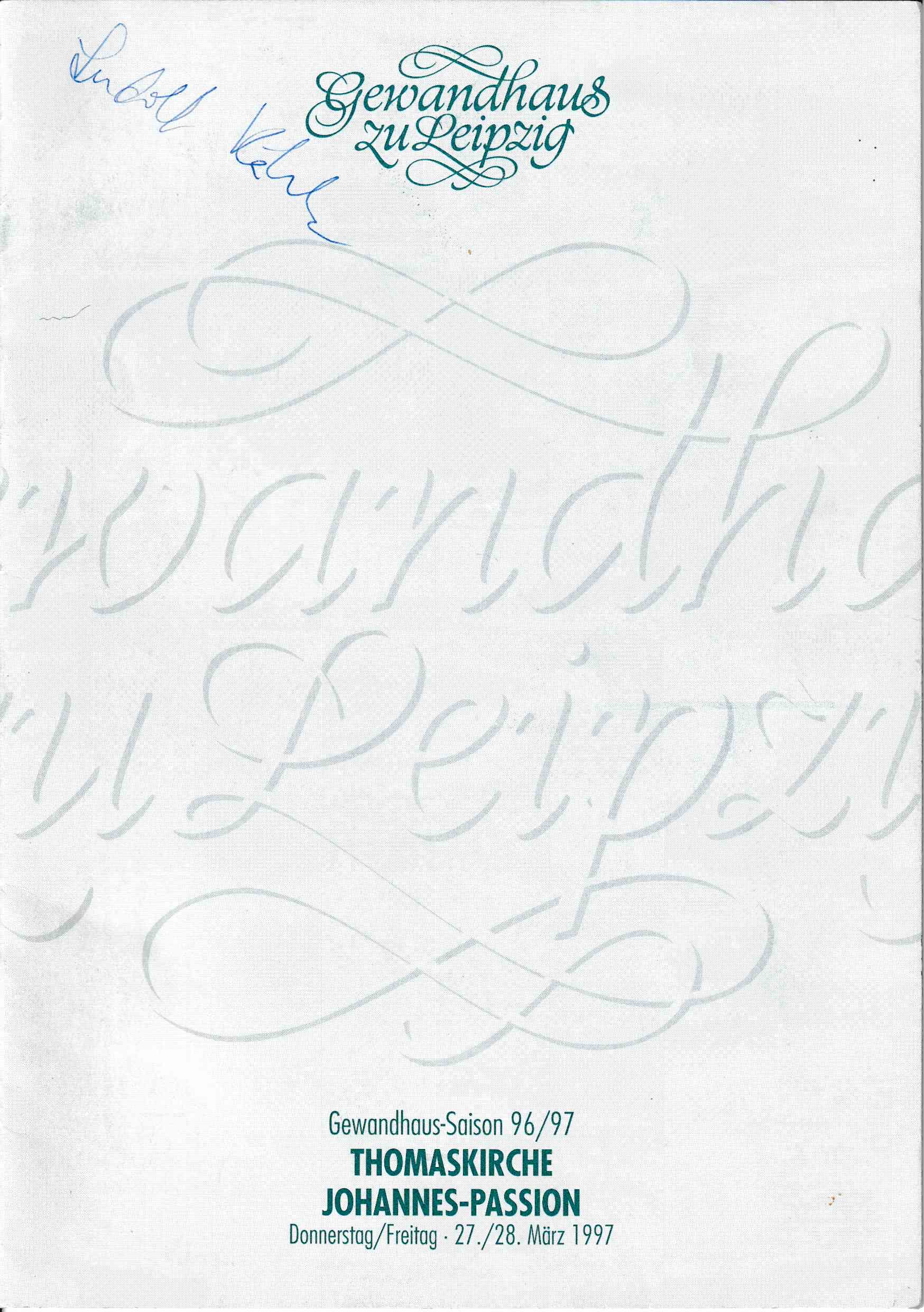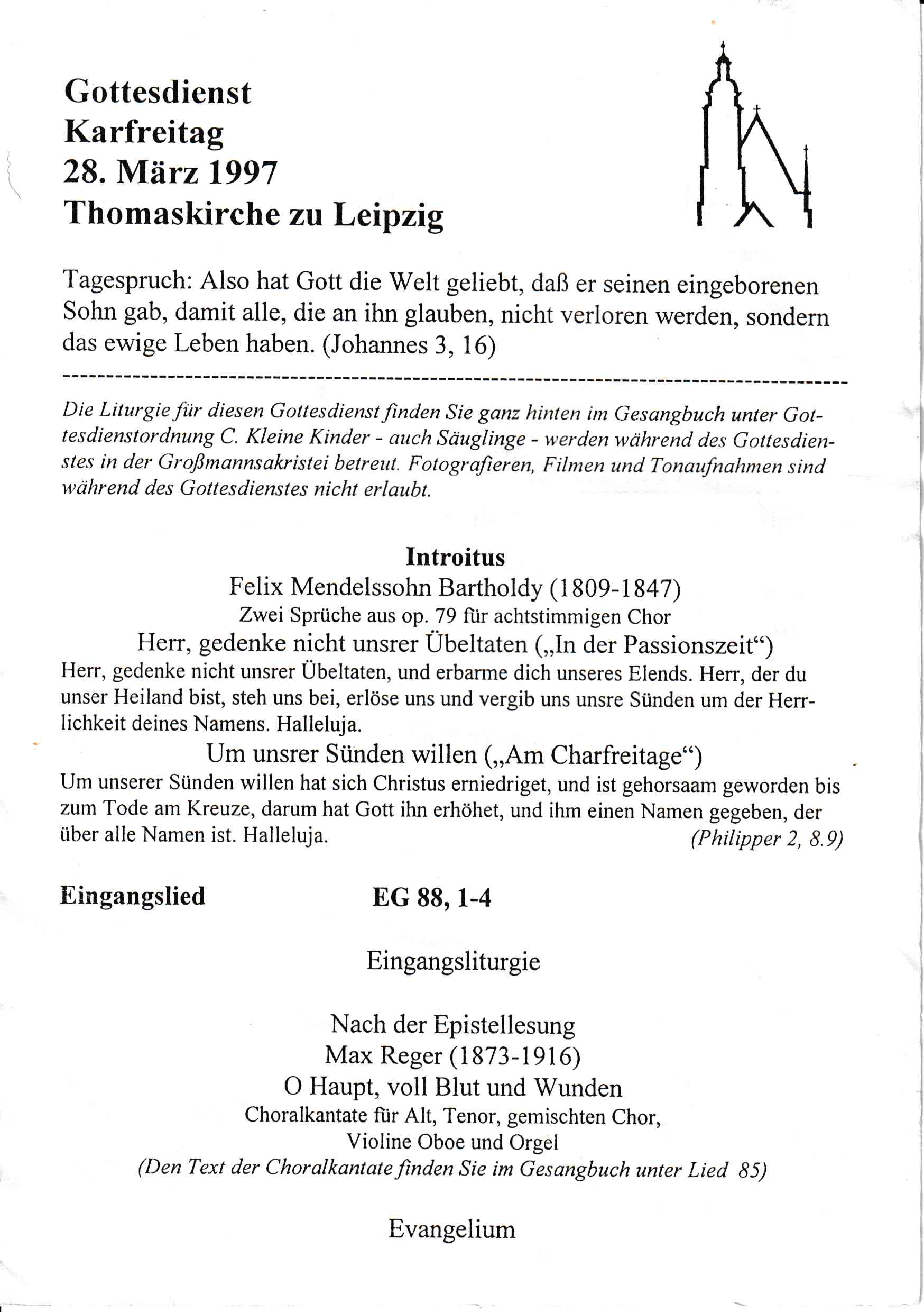 聴く目的で旅をしたのは、1997年3月末から4月のイースター前後に教会で音楽を聴くことだった。ハイライトはドイツ・ライプツィヒの聖トーマス教会で、J.S.バッハの「受難曲」を聴くことにあった。この年は「ヨハネ受難曲」が演奏されたが、イエス・キリストが十字架で息たえた金曜日の演奏会は売り切れで、前日木曜日の演奏会を聴くことができた。途中、救急車のサイレンが隣接する道路に鳴り響くハプニングもあったが、何よりも演奏会が終わった後の拍手がなかったことに驚いた。これは、単なる演奏会という意味ではなく、キリストの受難を心に留める伝統や文化が長い歴史を経ていたことに深く感銘を受けた。その翌朝に同じ聖トーマス教会で行われた聖金曜日の礼拝に出席することができた。バッハの受難曲以外の音楽にも接することができた。特に、マックス・レーガーのコラールカンタータ「血潮したたる主のみ頭 」”O Haupt voll Blut und Wunden”や歌ったことのあるメンデルスゾーンの「6つの箴言」から「受難節に」「聖金曜日」の受難に関する2曲を聴くことができた。