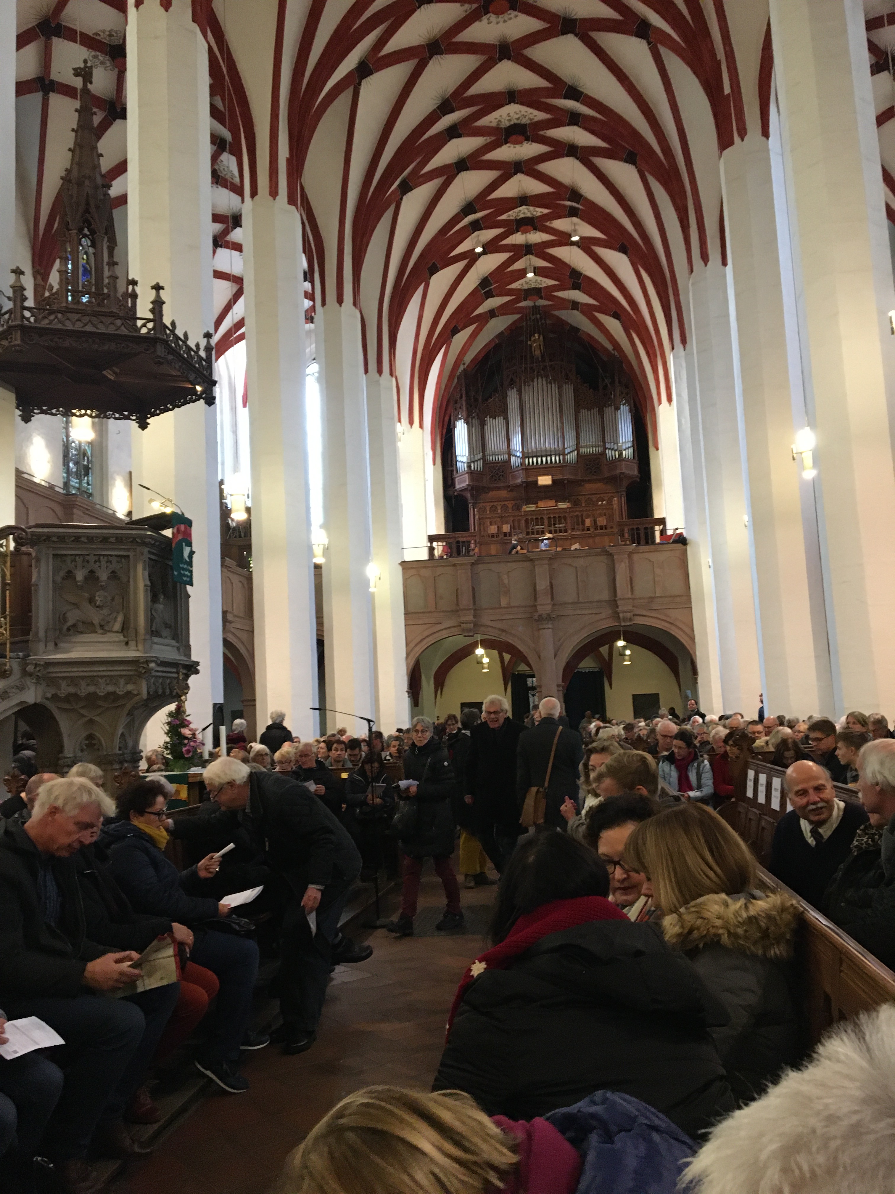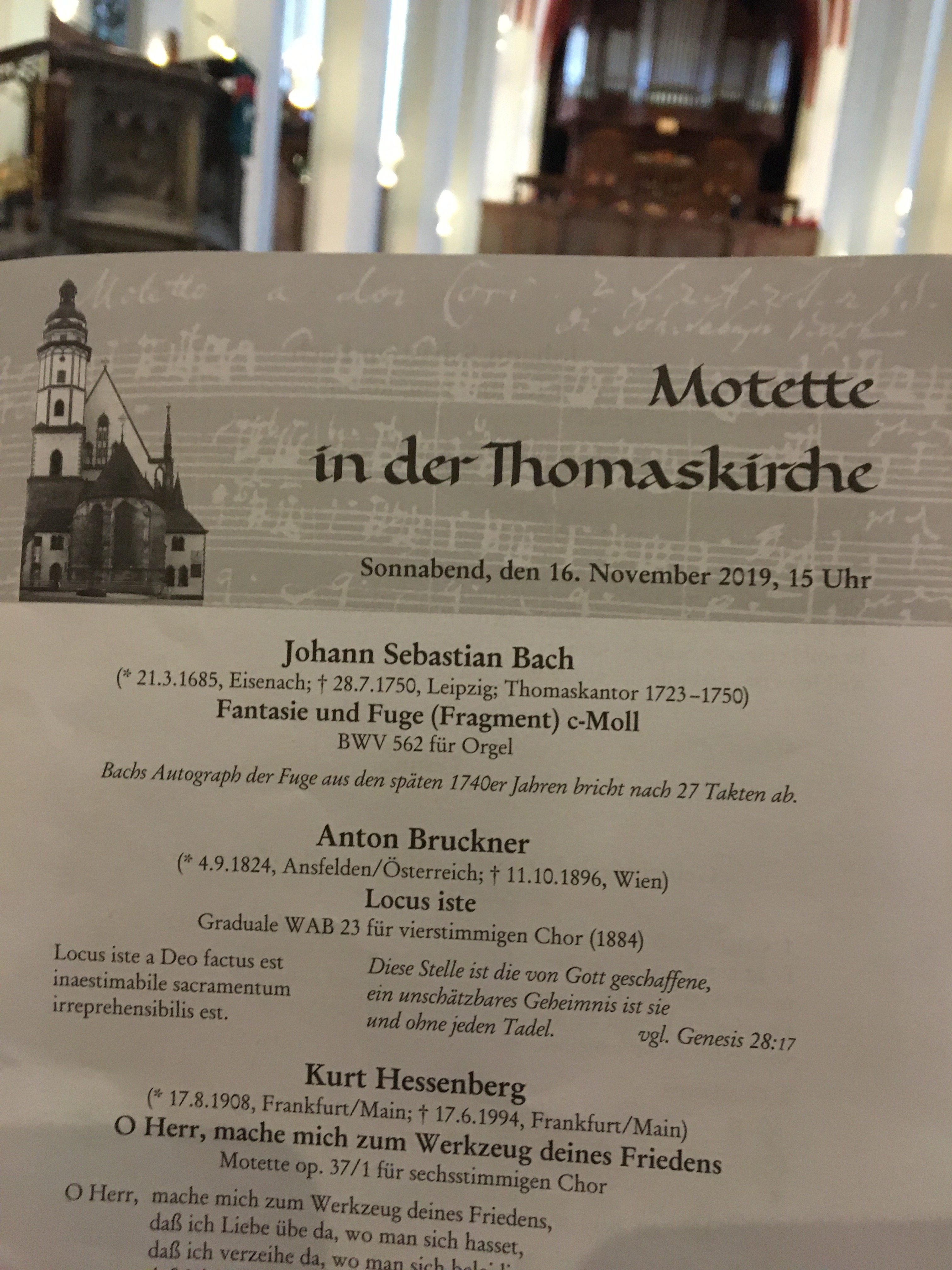 上の写真はいずれも2019年11月のライプツィヒ聖トーマス教会である。土曜日15時からのモテットで少年聖歌隊が登場するとあって、礼拝開始の15分前の開場を前に、ご覧の通り入口には長蛇の列ができている。教会の中に入ると、指定席ではないので見通しの良い席から埋まっていく。世界的にも有名であり、ドイツ語以外のさまざまな言語が聴こえてきて、地元の人たちよりも世界各国から観光客が多い印象だ。入場料の設定はないものの、プログラム代として2ユーロ支払うことになっている。プログラムは、オルガンの前奏、会衆賛美、聖歌隊の合唱、牧師の説教などで構成されており、1時間以上かかることもある。