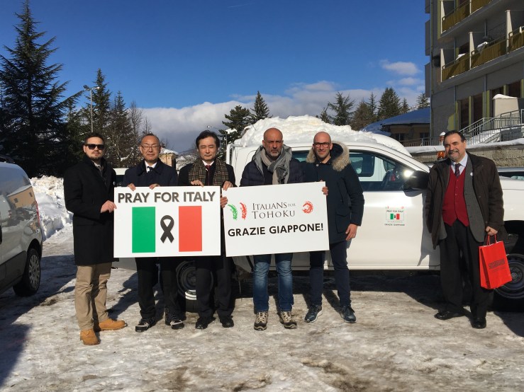 発生直後から、日本で活躍するイタリア人レーシングドライバーたちが呼びかけ、募金活動が行われた。名前も”PRAY FOR ITALY”。2011年の東日本大震災で復興支援活動を行った”ITALIANS FOR TOHOKU”(東北復興のためのイタリア人会)が母体になって推進した。私はその事務局を預かっていた関係で、翌2017年1月21日アマトリーチェで、在ローマ日本大使館山内弘志公使(当時)と共に、セルジオ・ピロッツィ市長に寄贈する式を行うために、日本からステッカーやプレートなどを持参して向かった。