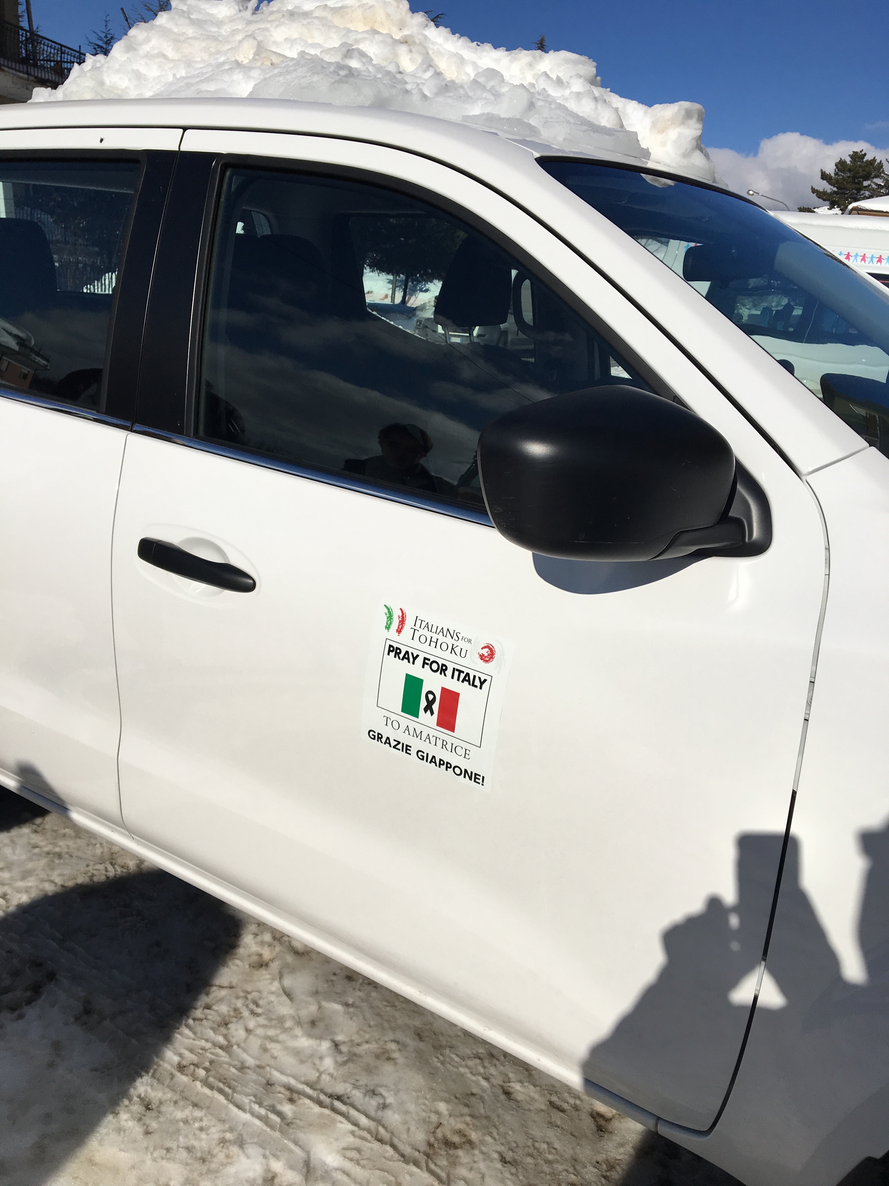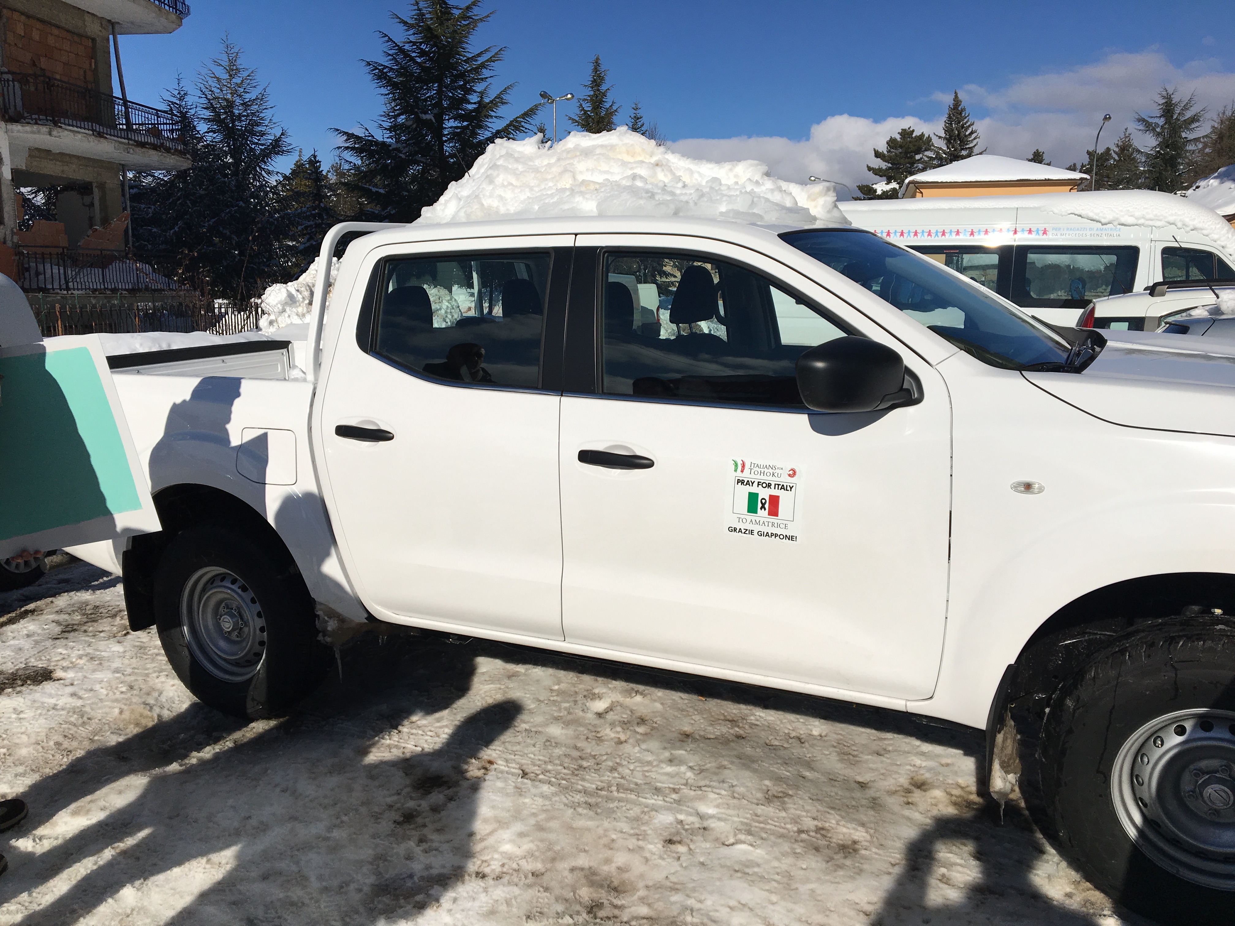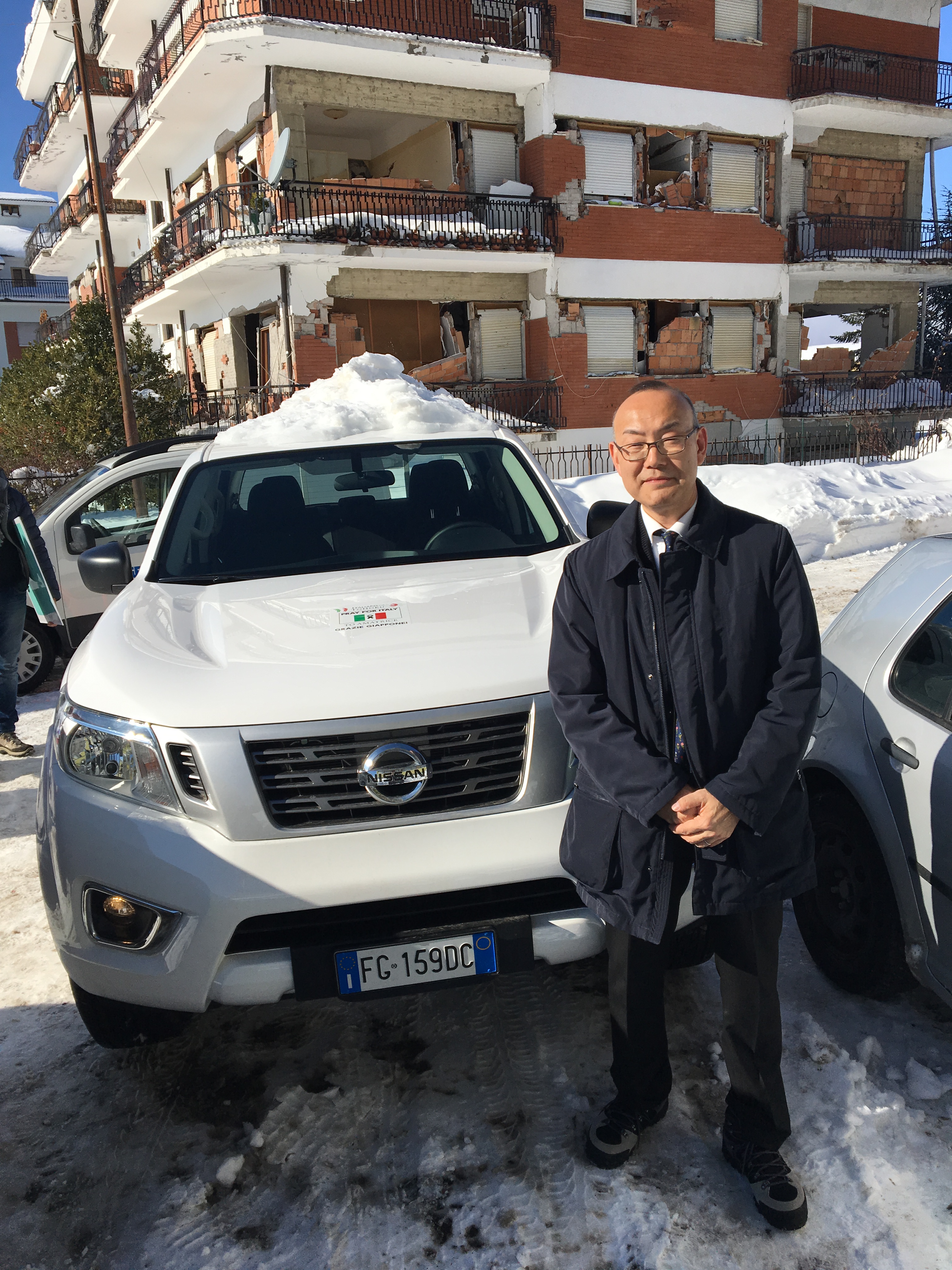 寄贈したのは日産の4WDピックアップトラックでホワイトのNAVARA。当地と連絡を取った上で、この車種が良いという話にまとまった。アマトリーチェはローマから2時間半くらい車で走った山岳地帯にある街で、避暑地として有名な場所でもある。そこが地震で一夜にして街が倒壊した。この年の冬は豪雪で、当初18日の予定だったが大雪と地震(余震)のため21日にスライドした。
