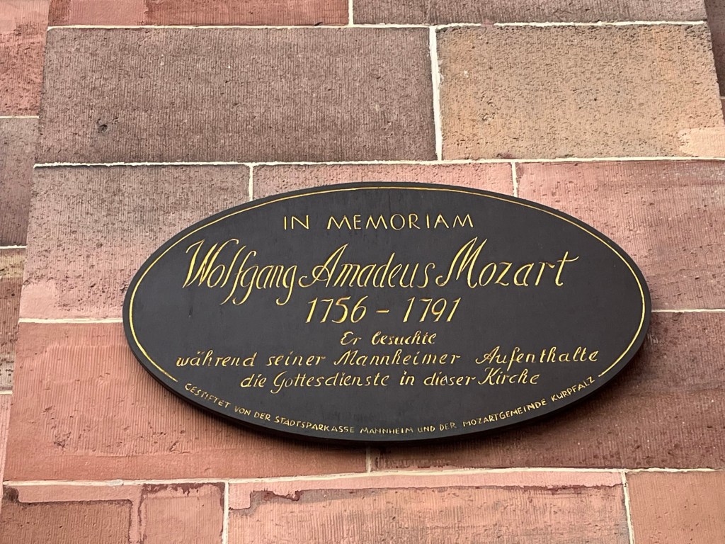 そして、マンハイムにゆかりのある歴史上の人物がいた。産業革命が起こる前の時代である。その名はW. A. モーツァルト(1756-91)である。日曜の早朝散歩でイエズス会教会を通りっかった時、壁に写真右のようなプレートが掲げられていたの偶然発見した。この教会のミサに出席したとパネルに記されている。写真は朝焼けの教会。