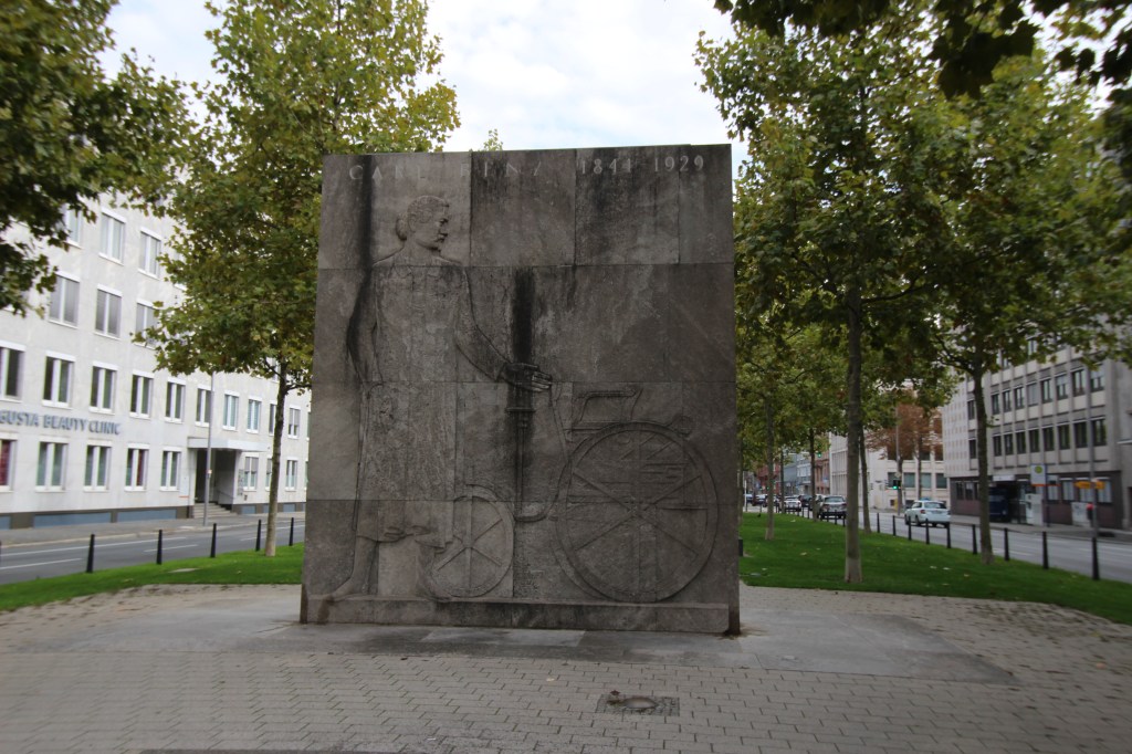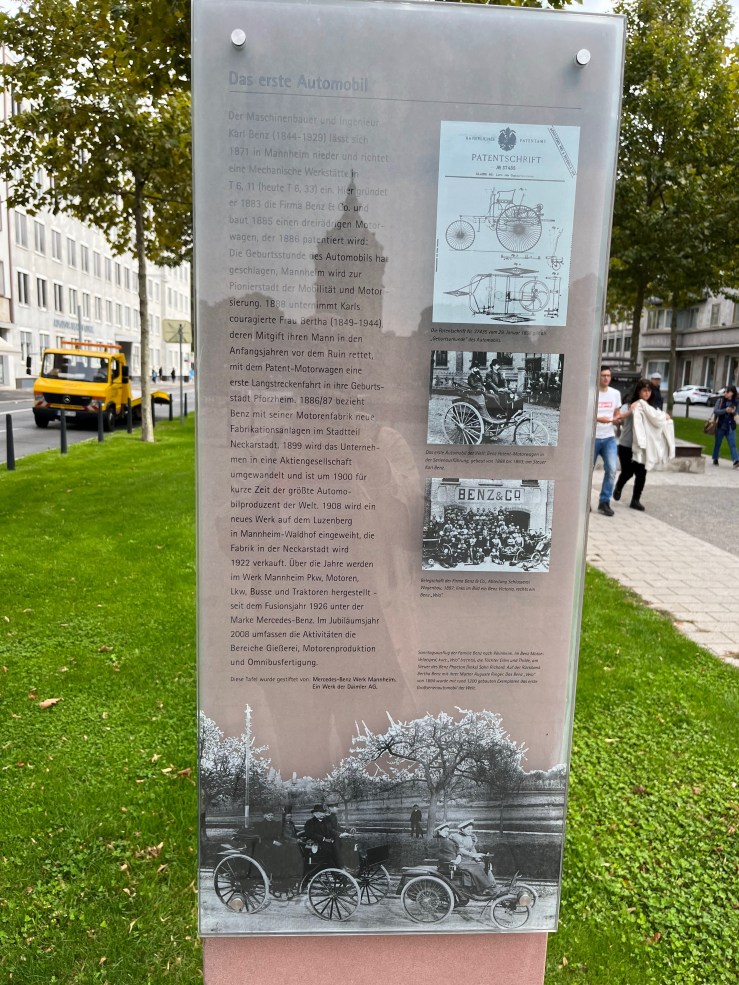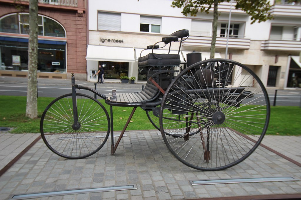 土曜日の午後、マンハイムの市街中心部も歩いた。フリードリヒ広場にあるカール・ベンツ(1844-1929)の記念モニュメントとともに、彼が1885年にこの街で製造した世界初の特許取得自動車「ベンツ・パテント・モトール・ヴァーゲン」というエンジンを載せた3輪自動車のレプリカが置かれていた。この技術がやがて、ベンツとゴットリープ・ダイムラーとともに今の世界的な自動車メーカーとなったメルセデスベンツ社の礎を築くことになったことを記念している。
