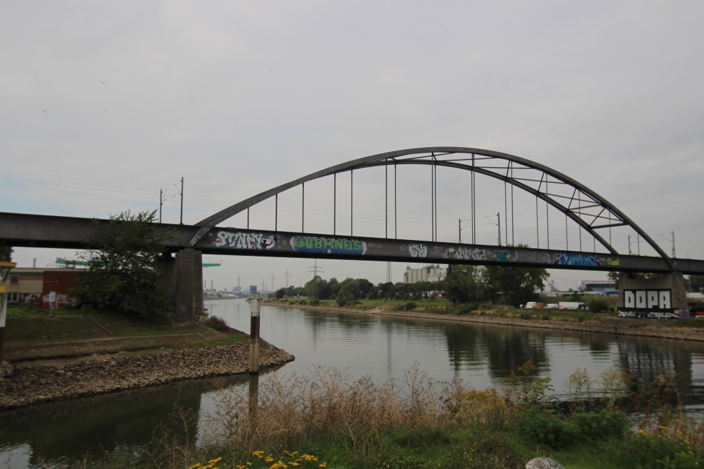 上の写真は、マンハイムでマイン川がライン川と合流する地点である。橋はマンハイム中央駅(写真左側方向に駅がある)の北側に位置して鉄道が走っている。奥に見える煙突はライン川の対岸にあるルートヴィヒスハーフェンという名前の街がある。